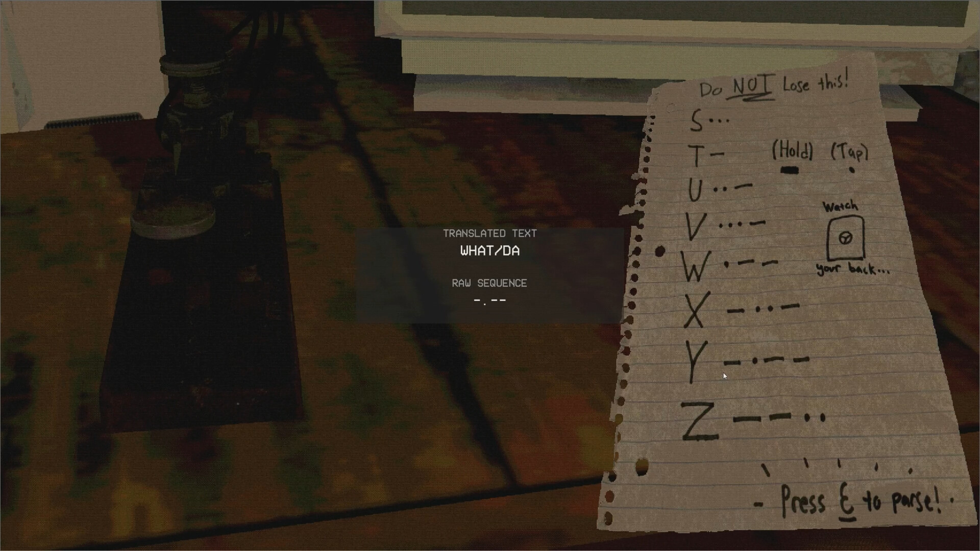 Congratulations! You have been selected to become a parser at MERCURIALCORP! Please follow all safety protocols when communicating with the entity. Keep the vault door closed. Translate messages efficiently, and know that you are being watched. A short morse code focused survival horror experience.