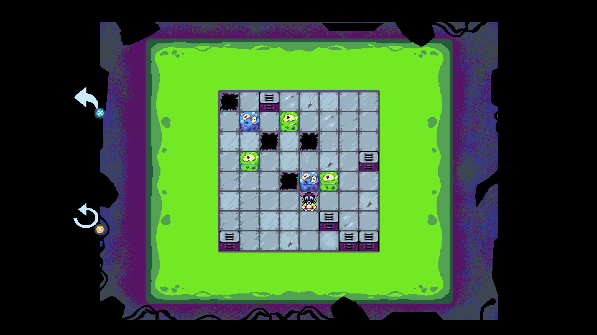 Slime Miner 2 is a sokoban inspired game evoking flash games and CD-ware of the early aughts with a total of 50+ slime splatting puzzles. To mine a slime, slam into it from a distance! Green slimes will splat in one slam, leaving you standing on the same spot your enemy was. Slimes with more eyes require more mining to splat - if there's room behind one, you'll push them one tile and end up where they started, but if there isn't room, you'll be stopped in your tracks!