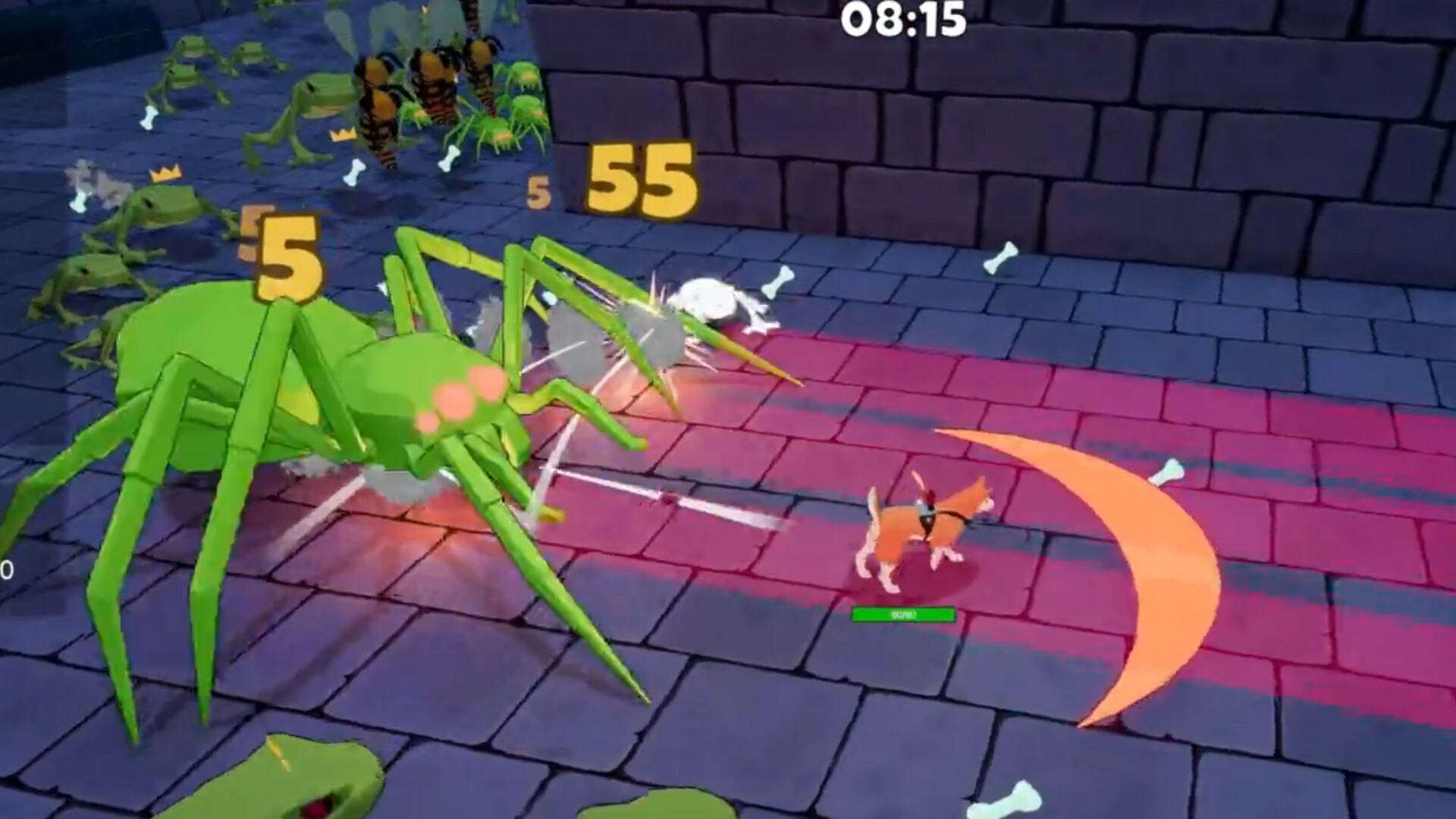 A 3D, action roguelike, bullet heaven game where you play as a dog with weapons attached to your harness to defeat hordes of giant spiders and save sheep