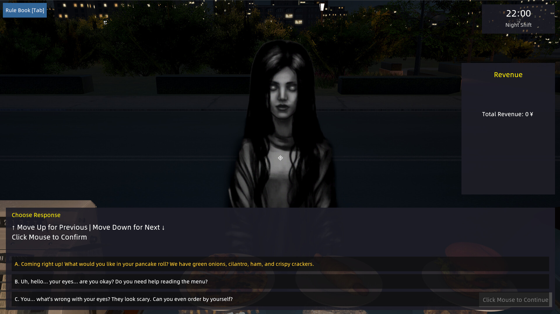 Dialogue Gameplay: Players must use dialogue options to probe customers, as this is the only reliable way to determine their true nature.