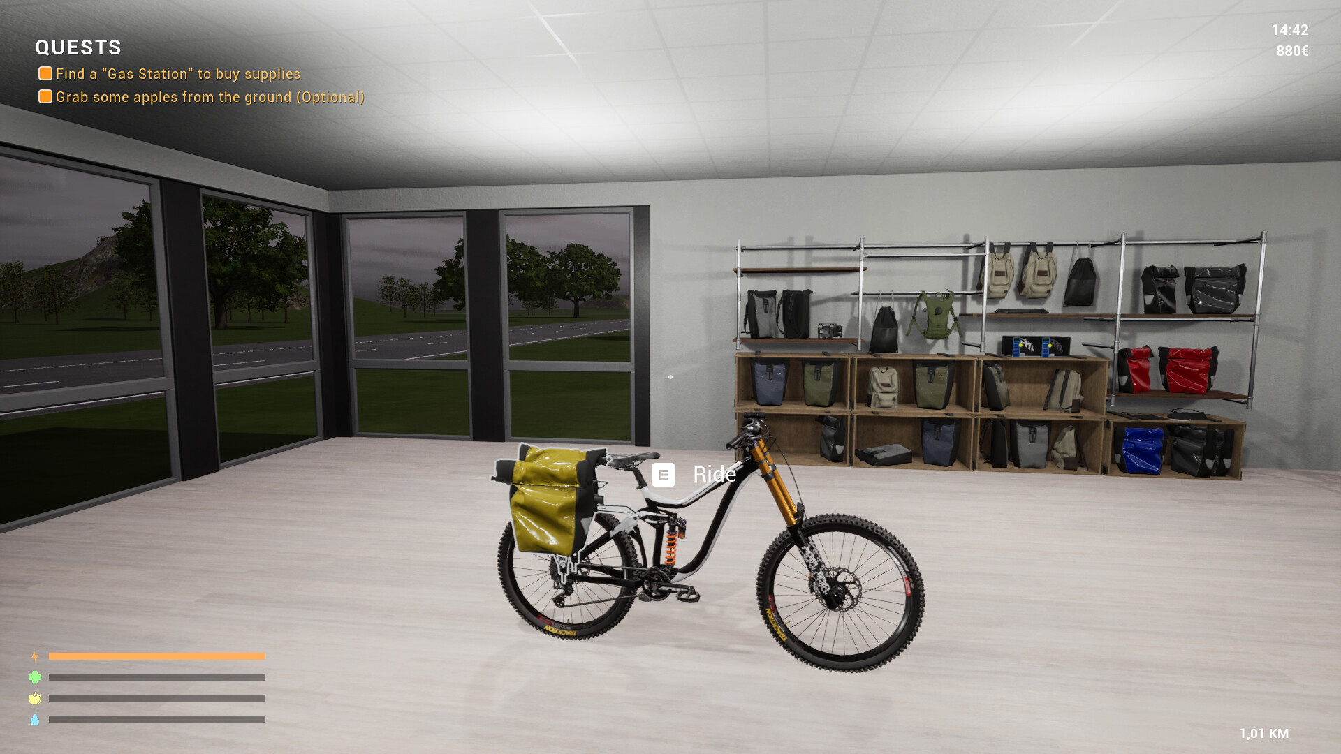 🎒 Manage the character's outfir and equipment and the bike inventory to distribute your resources between panniers