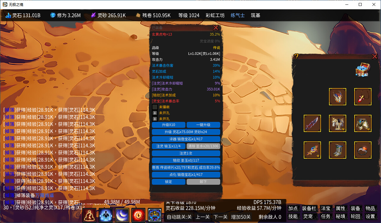 • Gear Growth: Equipment has both a level and a spirit level. The spirit level can be upgraded with gold and shards; it does not reset upon reincarnation and can reach up to your character's current level, saving you from frequent gear swaps after rebirth.