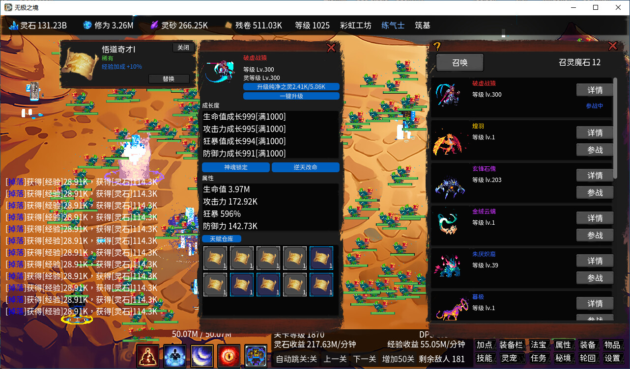 • Gear Growth: Equipment has both a level and a spirit level. The spirit level can be upgraded with gold and shards; it does not reset upon reincarnation and can reach up to your character's current level, saving you from frequent gear swaps after rebirth.