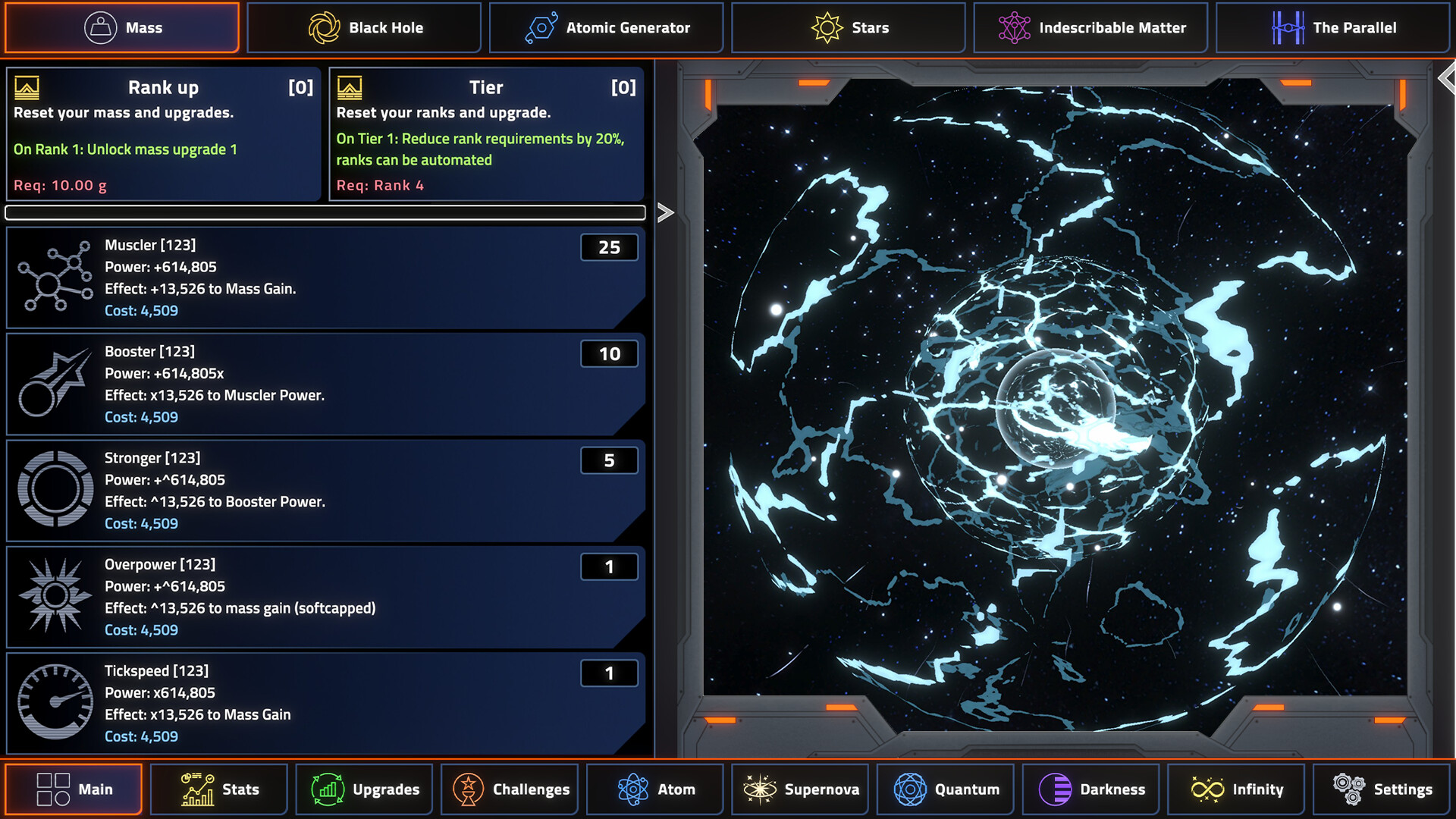 Each layer introduces dozens of sub-systems: upgrade webs, resource conversions, automation chains, scaling softcaps, hardcaps, and mechanics that interact in multiplicative cascades. At some point, you stop playing the numbers and the numbers start playing you. Who needs friends when you're gaining mass like there's no tomorrow?