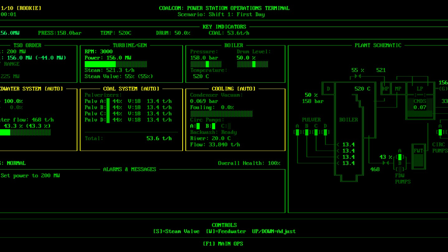 Manage boiler pressure, drum water level, coal feed, and cooling while responding to grid demands and equipment failures in real-time. Change one thing, watch three others respond. Make decisions fast when faults cascade.