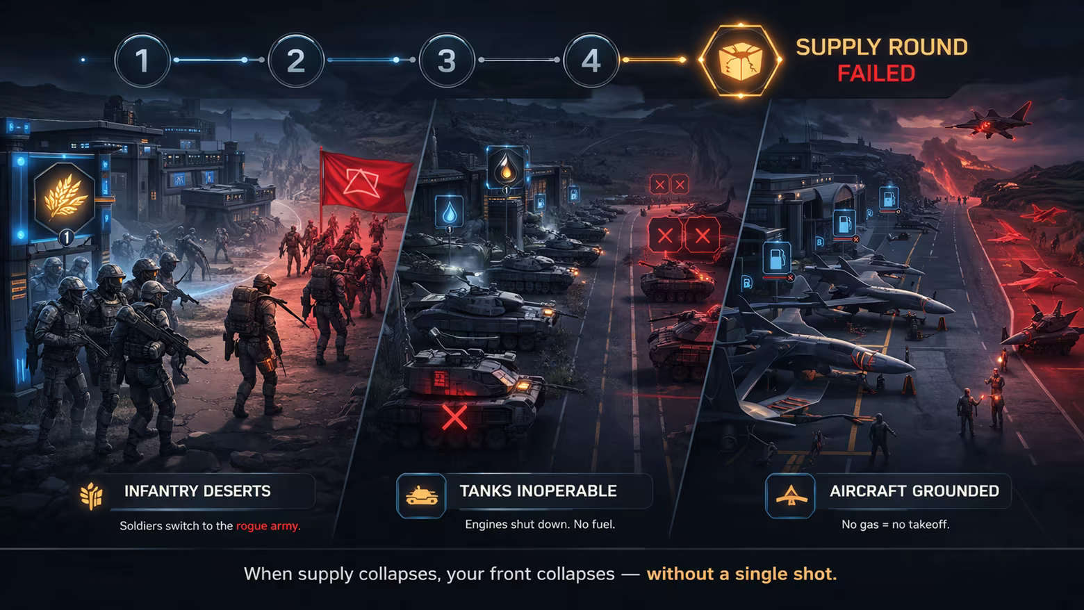 Food, oil, and gas determine whether your army keeps fighting… or begins to collapse.