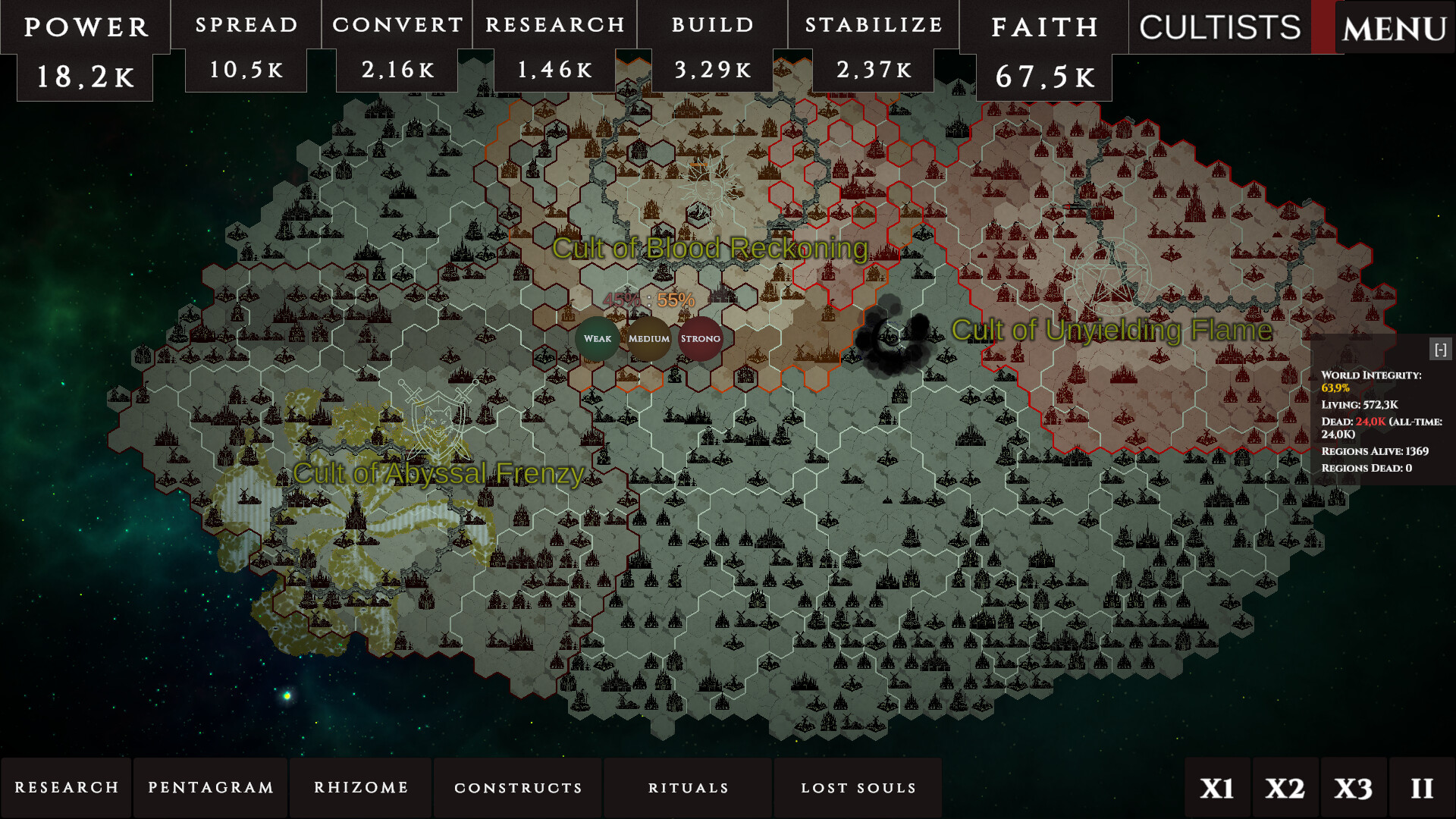 A global strategy game, simulating a cult in a dying world. The only salvation is faith. Forge a god from the fears and hopes of a dying humanity. Spread your ideas like a virus, mutate dogmas, and battle other egregores for the last souls on Earth.