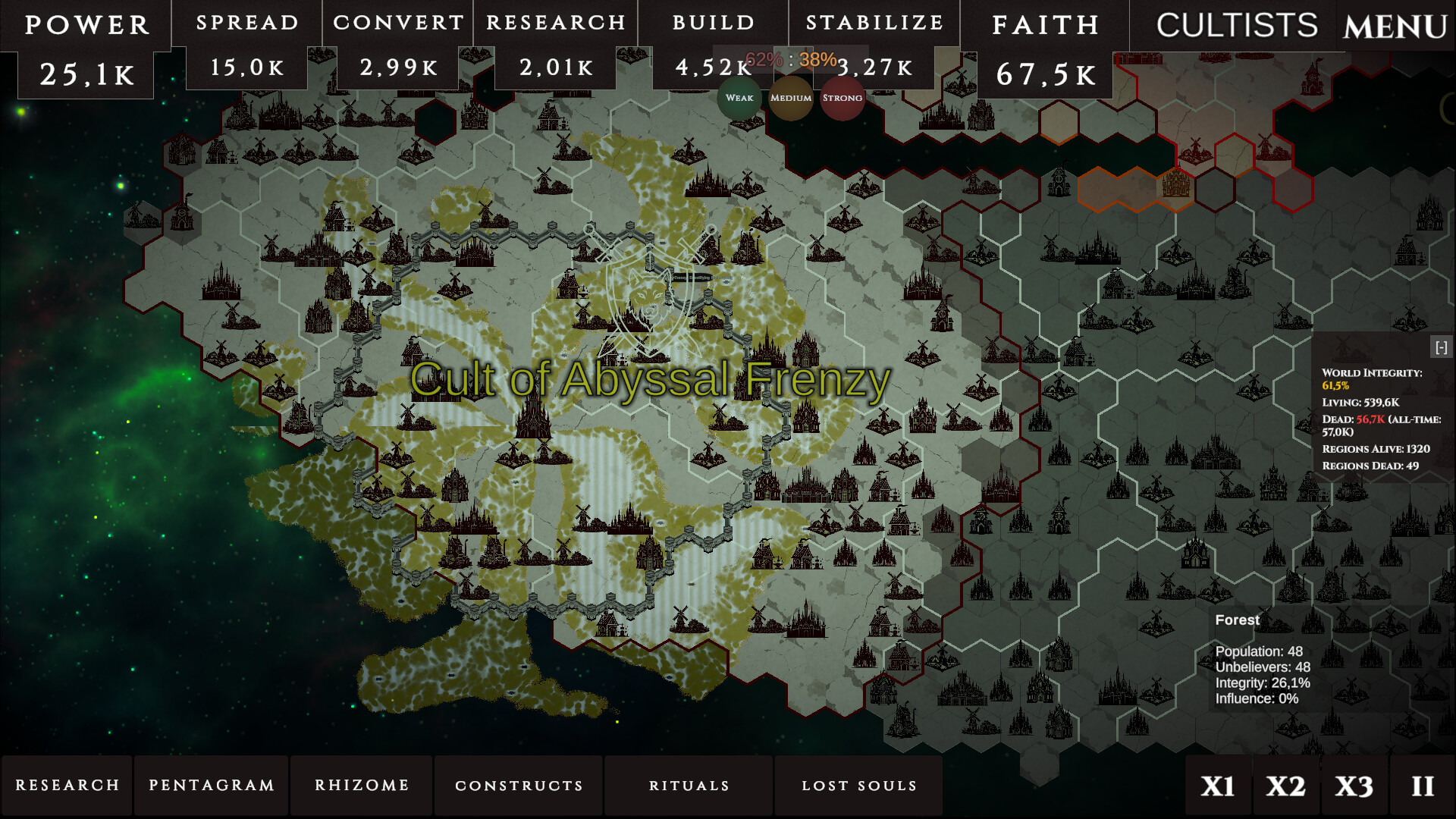 A global strategy game, simulating a cult in a dying world. The only salvation is faith. Forge a god from the fears and hopes of a dying humanity. Spread your ideas like a virus, mutate dogmas, and battle other egregores for the last souls on Earth.