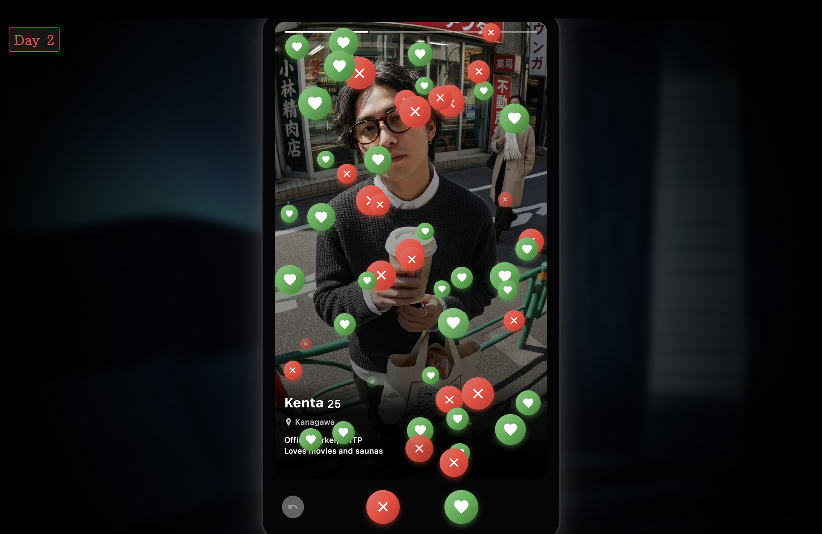 • A distinctive UI faithfully recreating a dating app — with "Exit 8–style" horror layered on top
