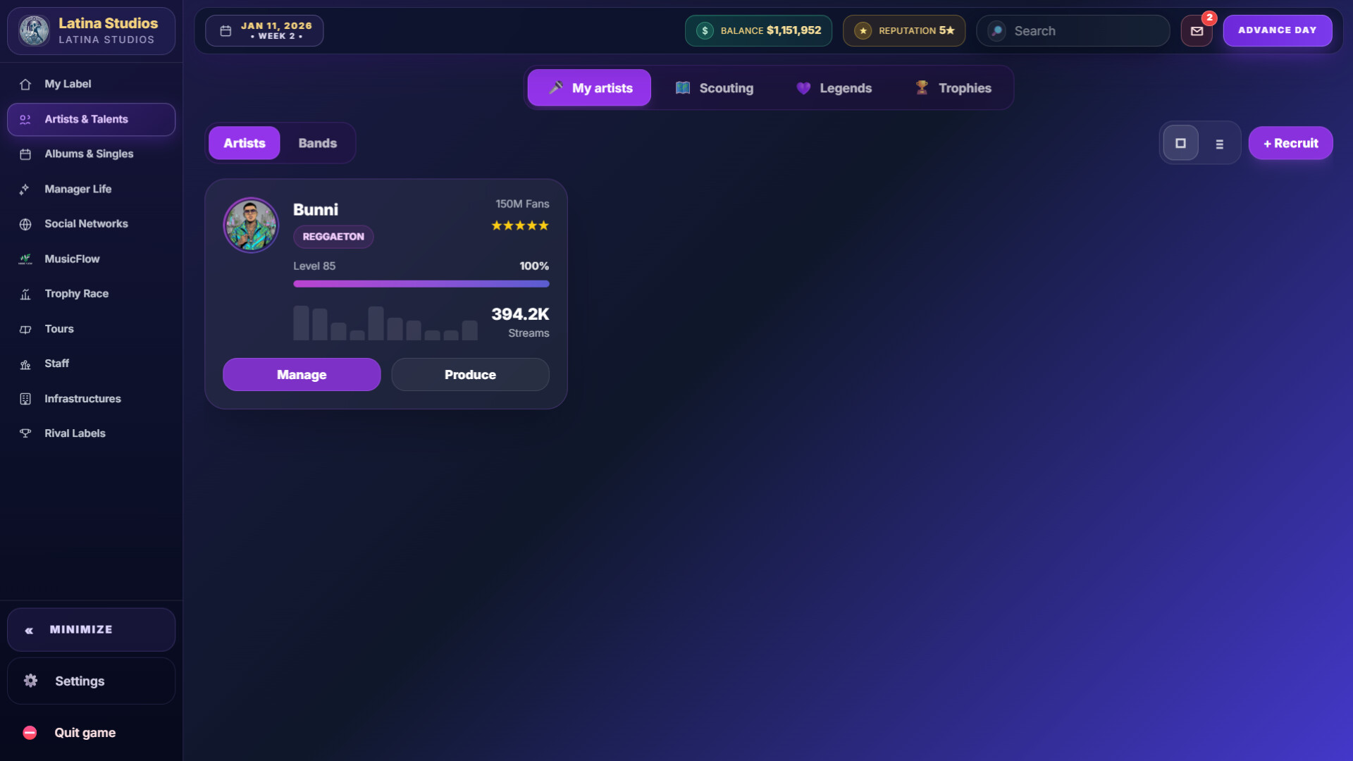 The game features a dynamic event system that affects both your artists and your label.