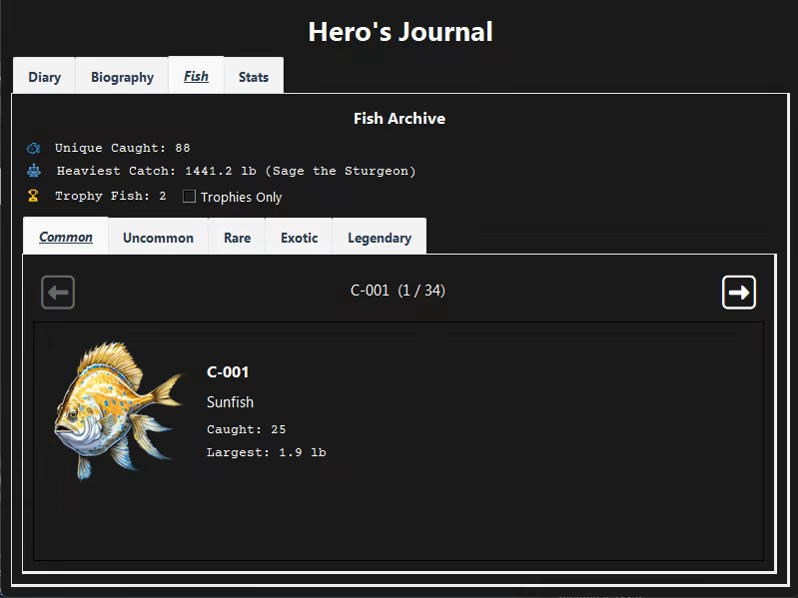 Track your progress over time with a journal of all the fish you've caught and all the friend's you met along the way. Check on your trophy hauls, your favourite meal, how much gold you're making with the local merchants. You can monitor many forms of evolution of your chosen hero!