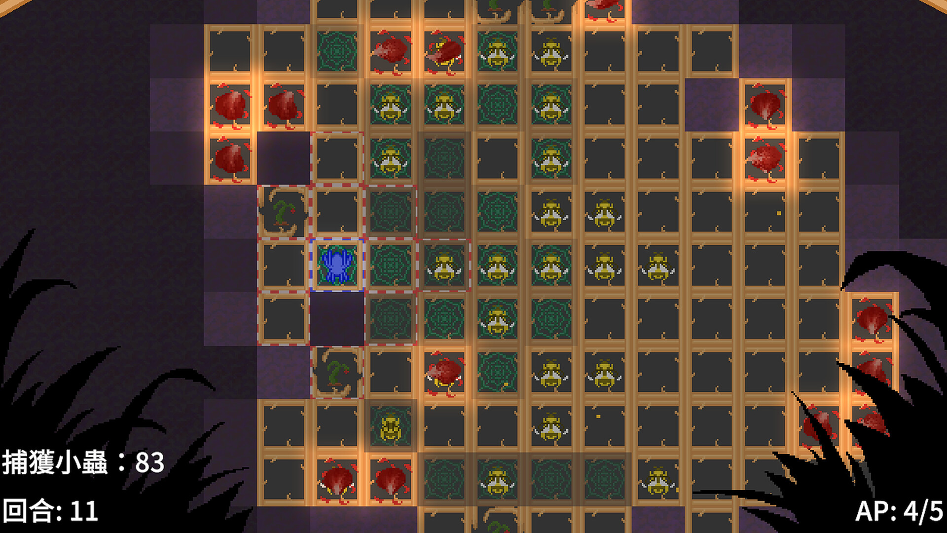 Every turn, you have three Action Points to spend. Move across your web, weave new territory on empty frames, or hunt insects to restore your energy.