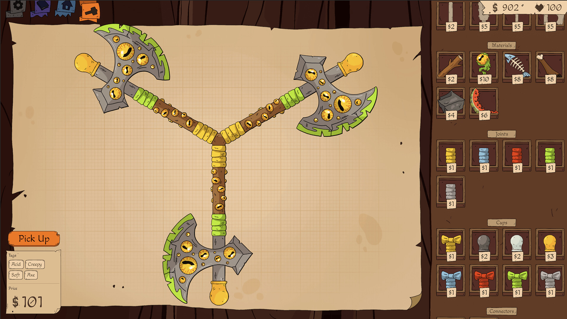 Earn likes as your shop grows and spend them to unlock new molds and materials so you can craft even weirder gear.