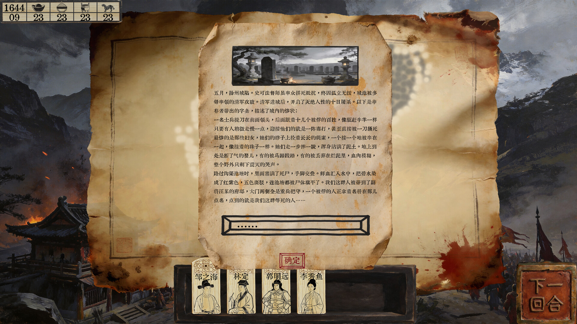 Initial Scenario [1644: The Jiashen Crisis]: Focuses on the Ming-Qing transition. Play as various figures and seek survival amidst total chaos.