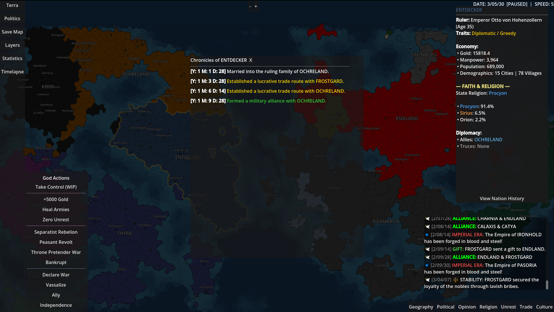 You have the power to change the world's destiny at any time; you are not merely an observer. Take direct leadership of a kingdom to lead it to worldwide conquest, start catastrophic civil wars in an enormous empire, or bestow a large treasure on a small underdog nation. All nations actions are recorded and is up for review whenever you want either as a timelapse or as a chronicle for each nation.