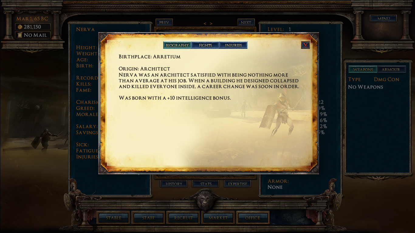 Age of Gladiators is a singleplayer strategy and management sim set during the height of the bloody games of ancient Rome. It blends elements of business simulation, stable management, training systems, tactical RPG combat, and sports sim-style character progression.