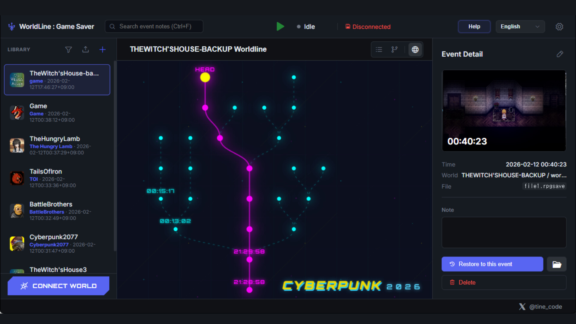 WorldLine: Game Saver adalah utilitas yang mendeteksi file penyimpanan game dan mengaturnya dalam bentuk linimasa serta percabangan (branches), sehingga Anda dapat mengelola permainan dengan banyak pilihan secara lebih jelas dan efisien.