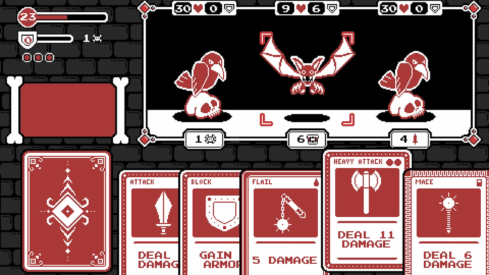 A retro roguelike deckbuilder where cards cost more than just energy. Descend the CARDaCOMBS, defeat monsters, and upgrade your deck with cards that cost energy, discards, blood, and MORE!!!