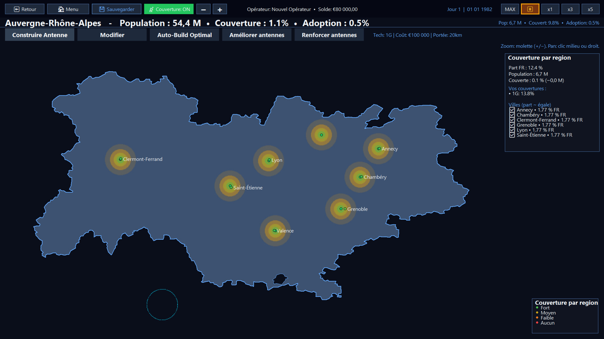 On a map of France divided into regions, you unlock territories, then place antennas to ensure coverage. Each antenna has a range, a technology (1G to 5G), and can be upgraded to increase its capacity. Coverage, deployment and maintenance costs, as well as competition, determine your revenue and market share.