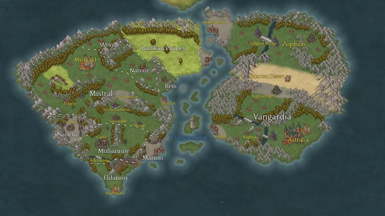 The story takes place on the continent of Vanacresia, which is divided into east and west.