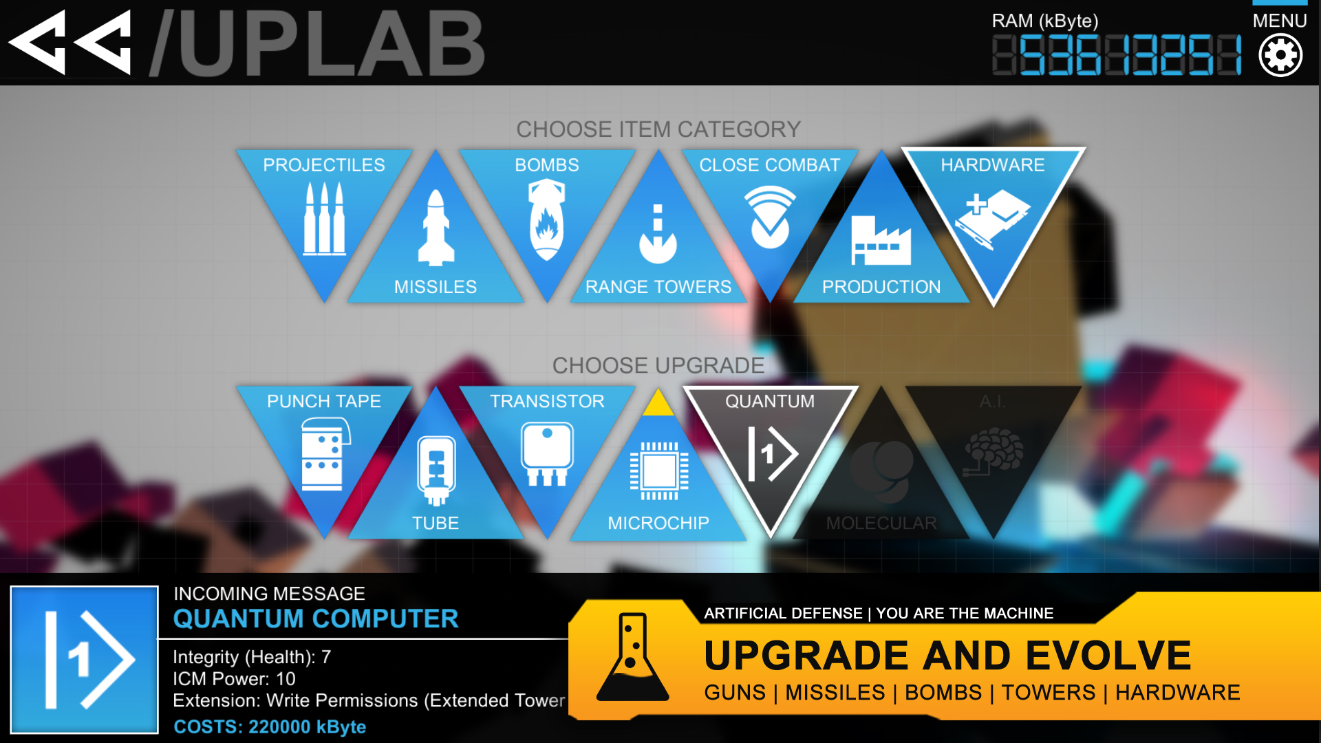 There are 21 offensive weapons available, reaching from outdated flintlocks, over maverick-missiles to devastating meteors and neutron-bombs. You can switch between three pre-loaded weapon categories and launch the installed weapons every few seconds. Each round you fire costs you RAM and each weapon type has its own unique cooldown so you must choose wisely and adapt quickly to different situations. But beware, aiming requires some skill. Creeps are moving targets and your projectiles need some flight time before impact. You can unlock and install new weapons in the uplab.[/b]
