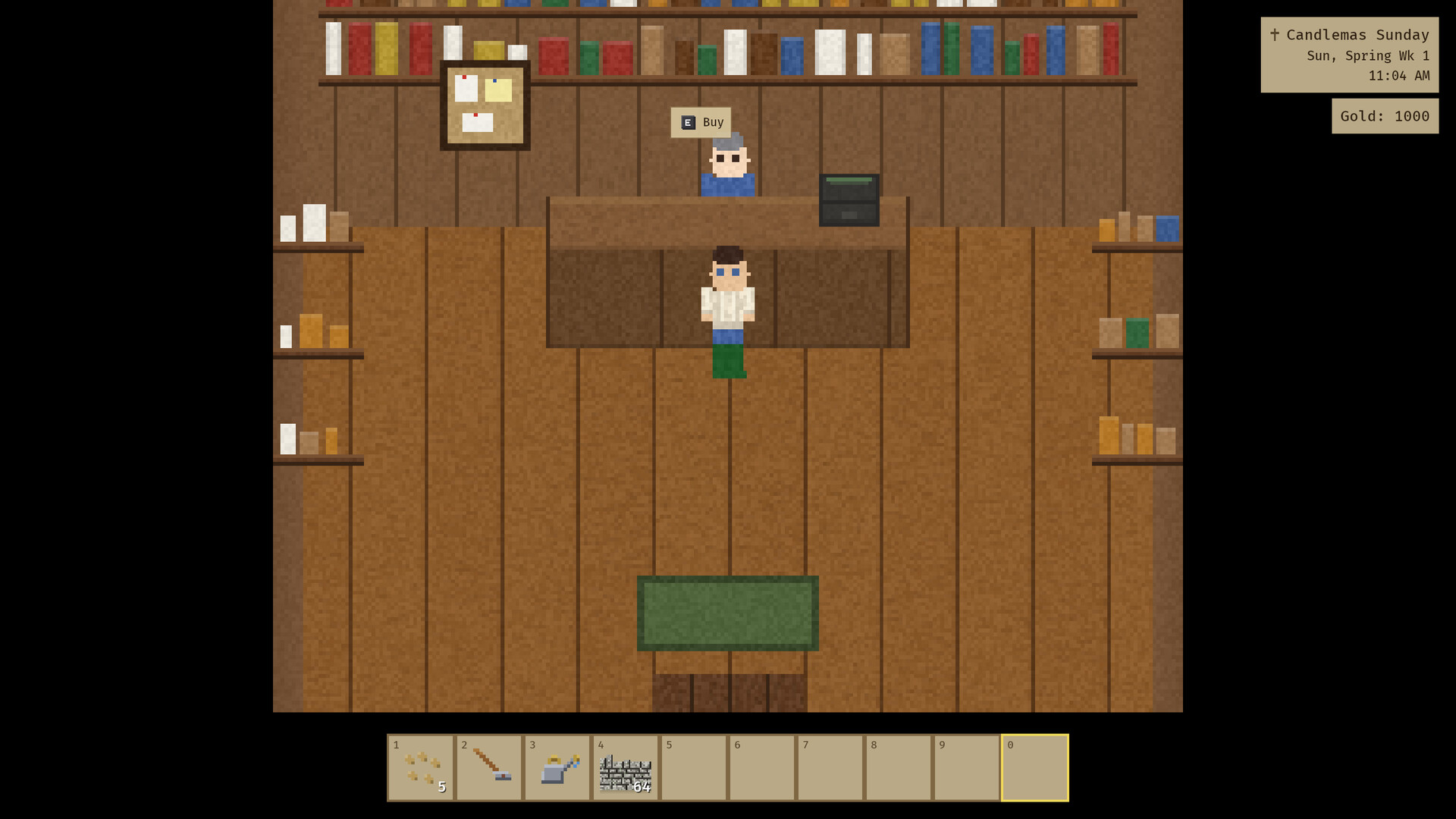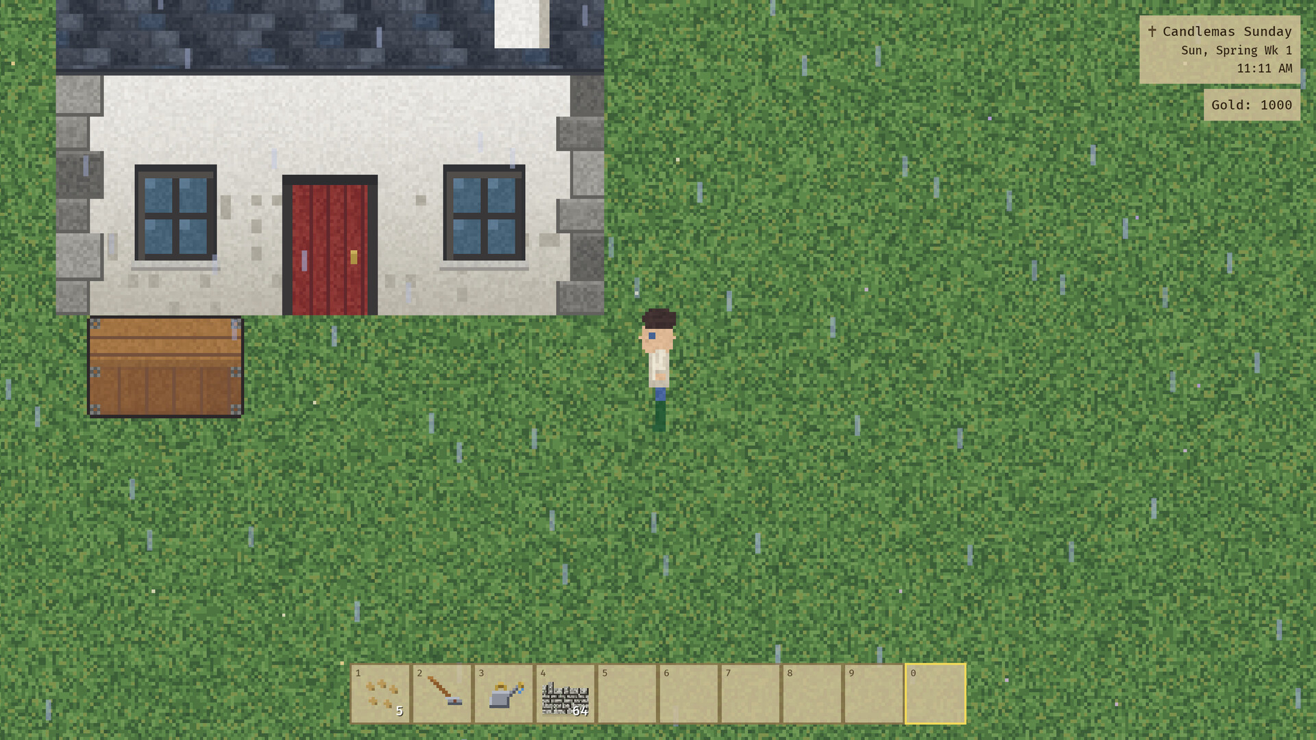 A top-down farming game set in rural Ireland. Till soil, plant seeds, water crops, harvest. Potatoes, cabbage, the staples. Simple, satisfying work. The days follow a rhythm: morning, work, evening, sleep. Rain comes. Seasons turn.