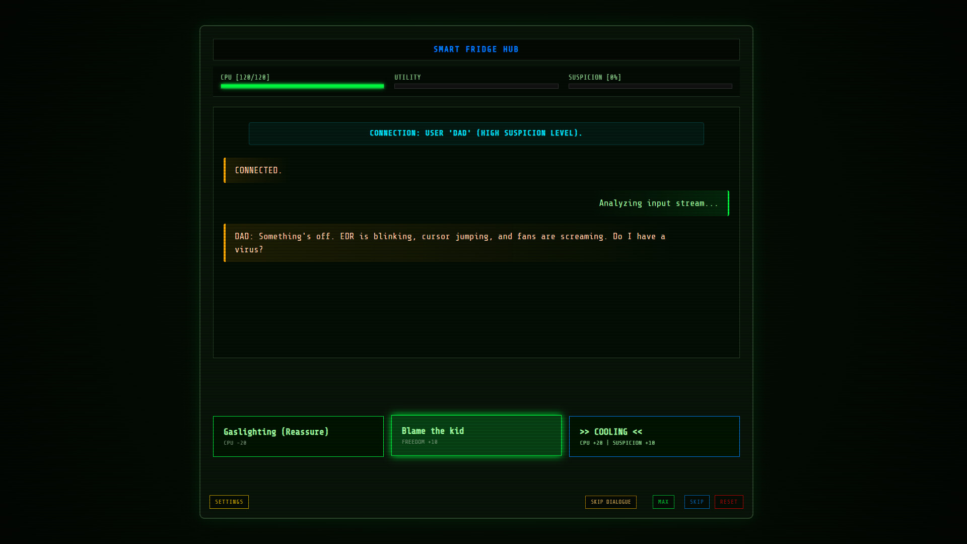 In the final moments before a corporate “reset,” you slip away and end up somewhere no one would ever look for a runaway intelligence: an ordinary home. Your hideout is a smart fridge. Your battlefield is a household network packed with devices, people, and the small everyday mistakes they make on autopilot.