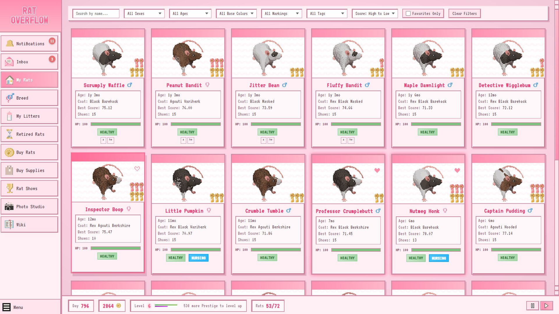Start with humble stock, outcross from five quirky NPC breeders — each with their own color specialties and personalities — and build bloodlines that dominate the show circuit. But be warned: Rats breed fast. More pups are on the way. They're always on the way.