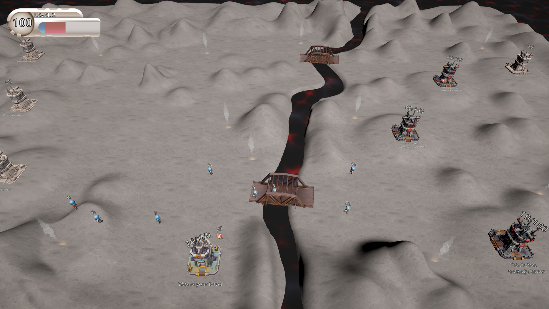 Чтобы победить необходимо захватить все башни на карте. Чтобы отправить войско нажмите на свою башню и оттяните мышь на вражескую или свободную башню.