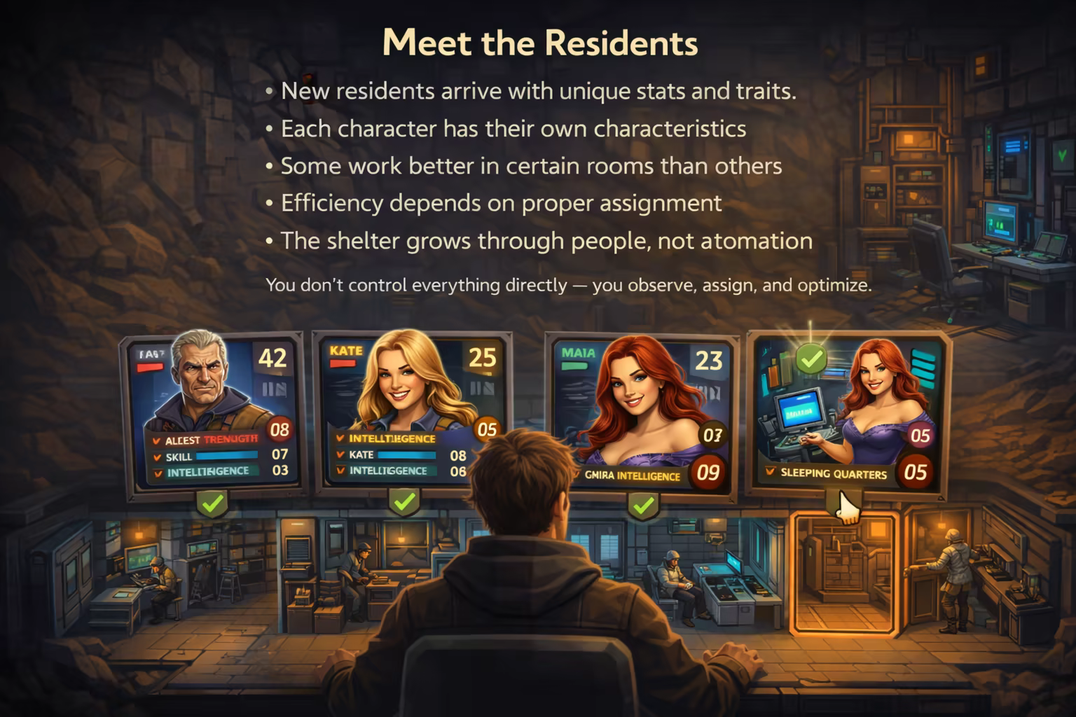 In Hidden Shelter (working title), you manage an underground refuge where survivors arrive one by one. Each person comes with their own characteristics, strengths, and limitations. Your task is simple in theory — give them a place in the shelter and put them to work.