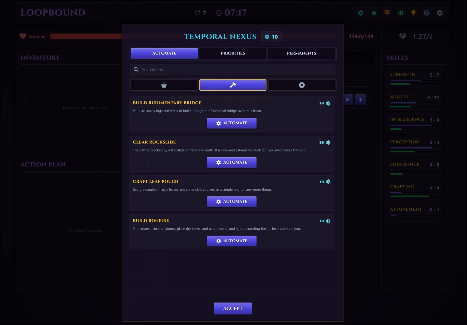 A narrative incremental game where you're trapped in a time loop: survive, level up skills, and automate tasks across multiple worlds.