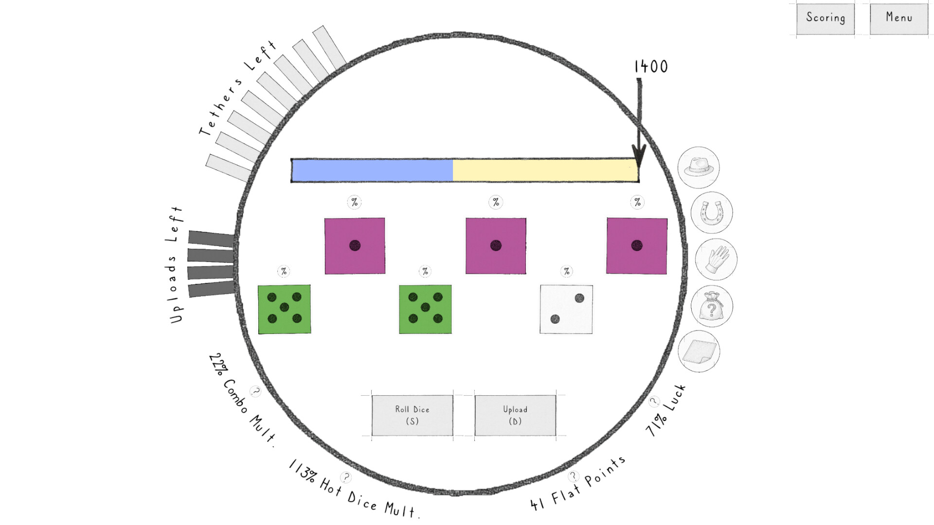 • Find the Coinpurse of Plenty to add flat points to your score and massively increase your "Hot Dice" multiplier.