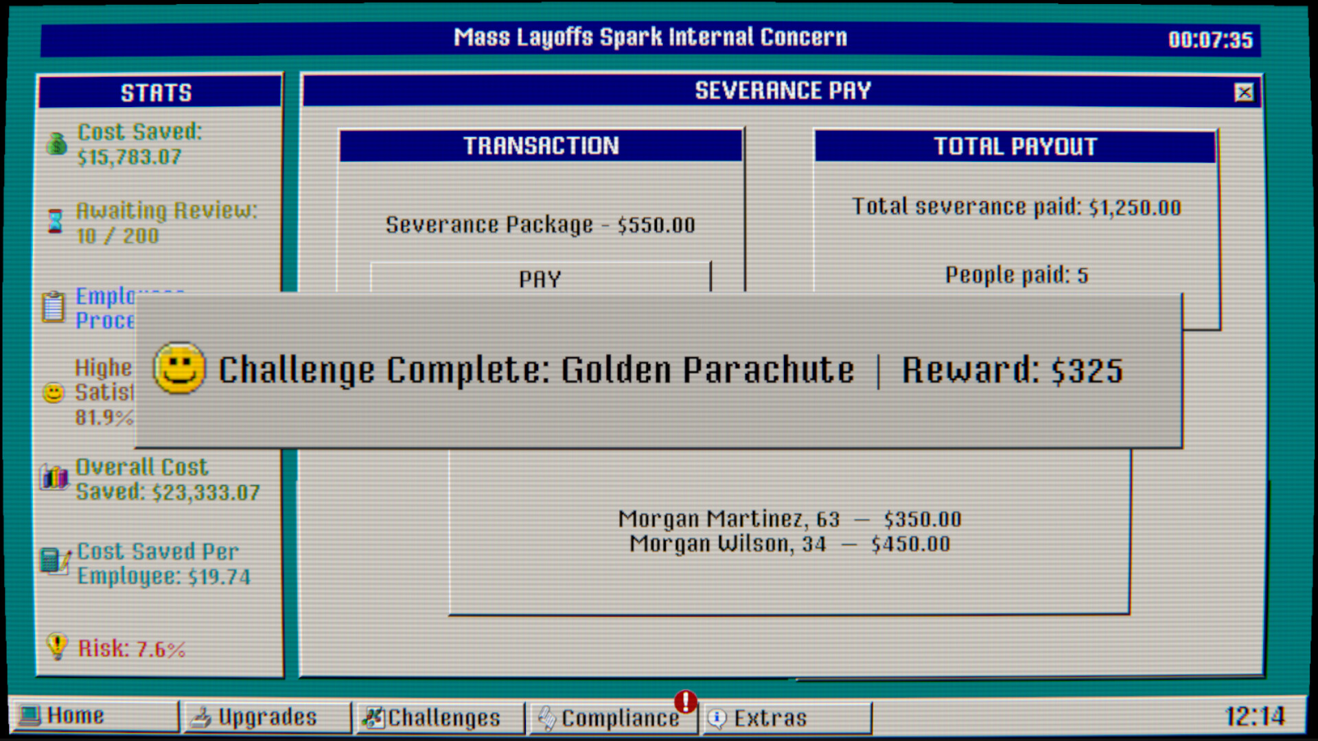 DOWNSIZING.EXE puts you in the chair of a corporate cost-cutter with one objective, save the company $300,000. Process employee reviews, approve terminations, and reinvest your savings into a growing suite of automation upgrades that keep the machine running with or without you.
