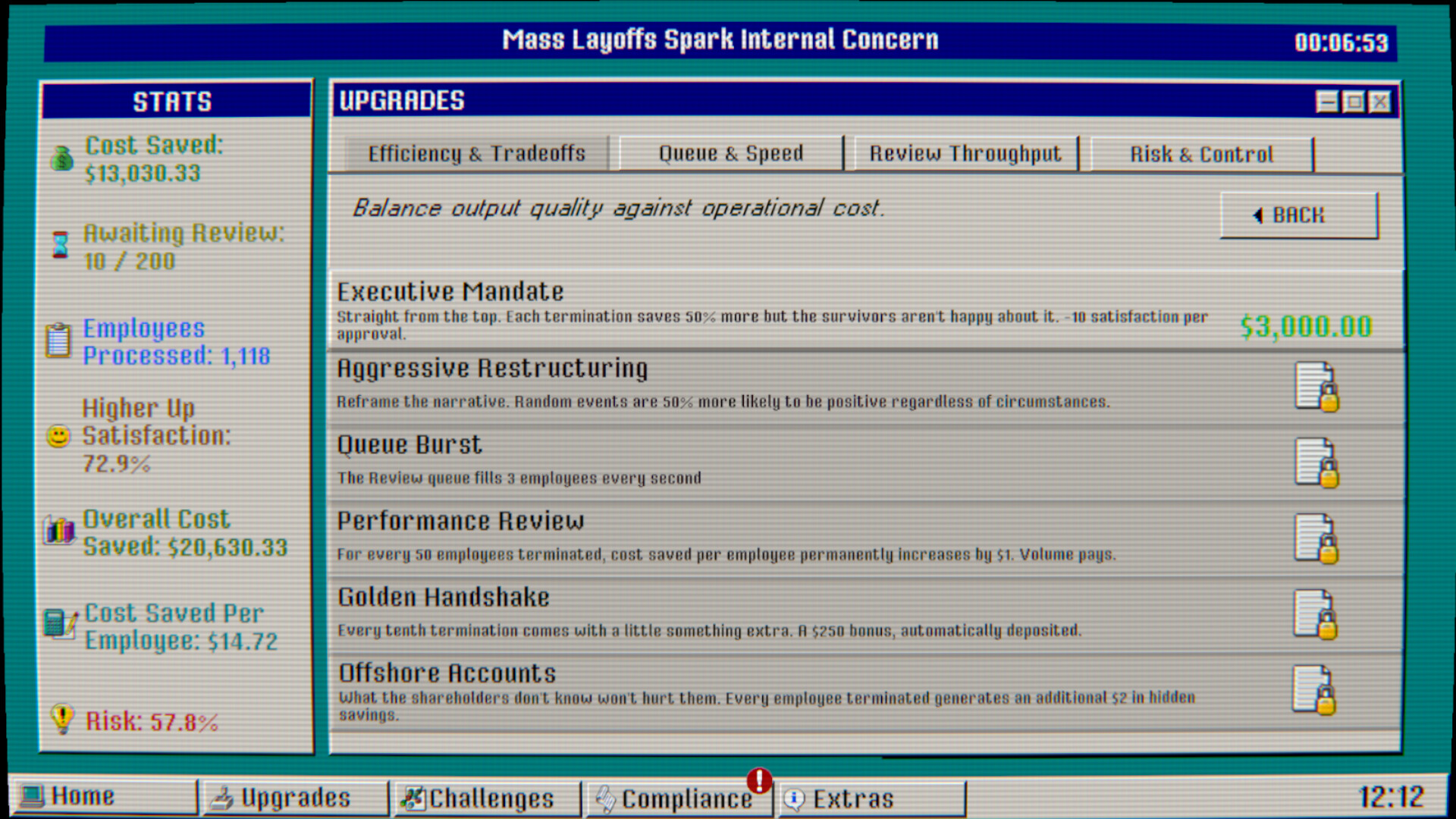Maximize profit. Minimize humanity. In Downsizing.exe, you are a cog in the dark corporate machine. Approve terminations, automate the grind, and slash costs. How much will you sacrifice for the firm?