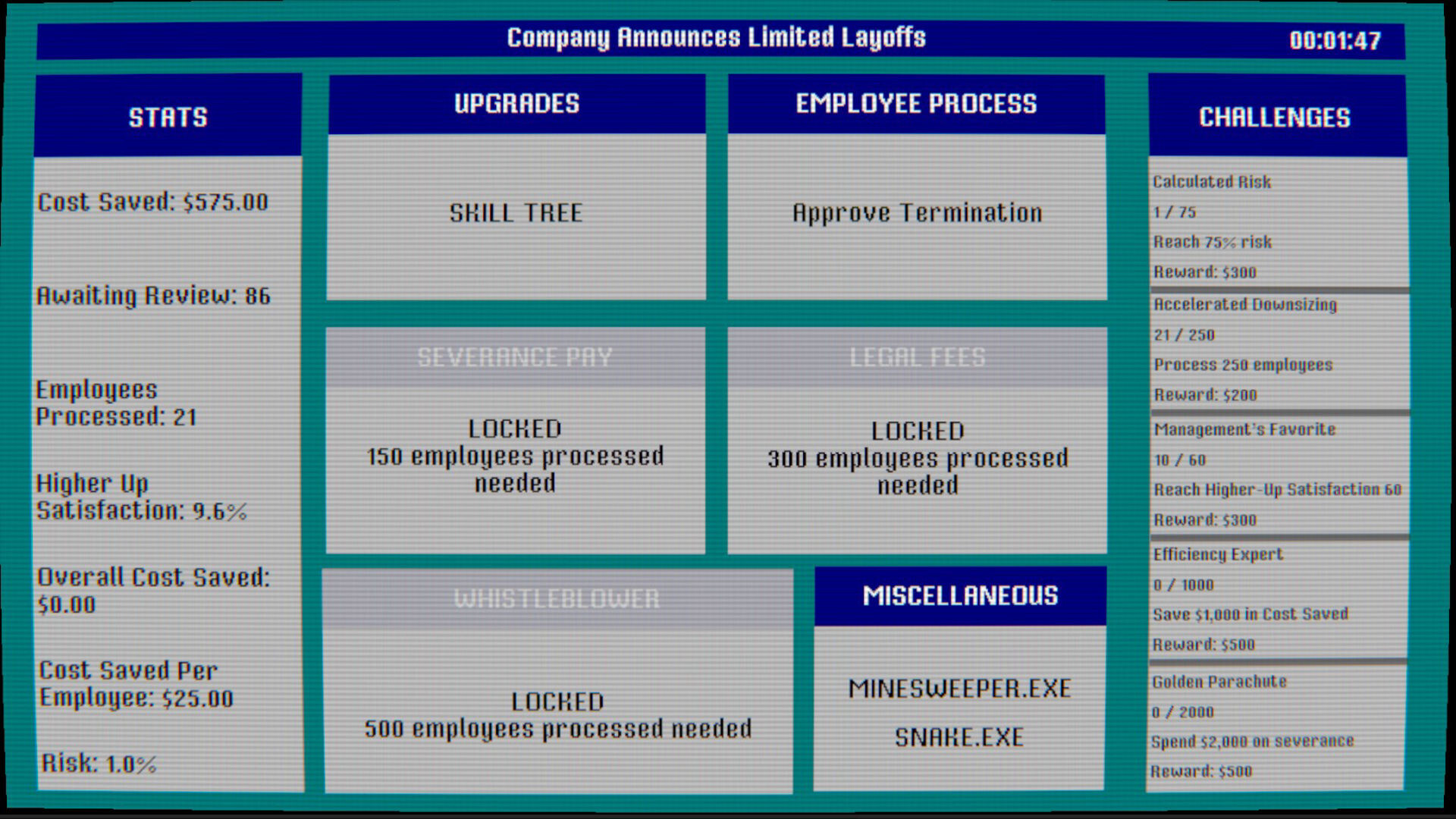 Maximize profit. Minimize humanity. In Downsizing.exe, you are a cog in the dark corporate machine. Approve terminations, automate the grind, and slash costs. How much will you sacrifice for the firm?