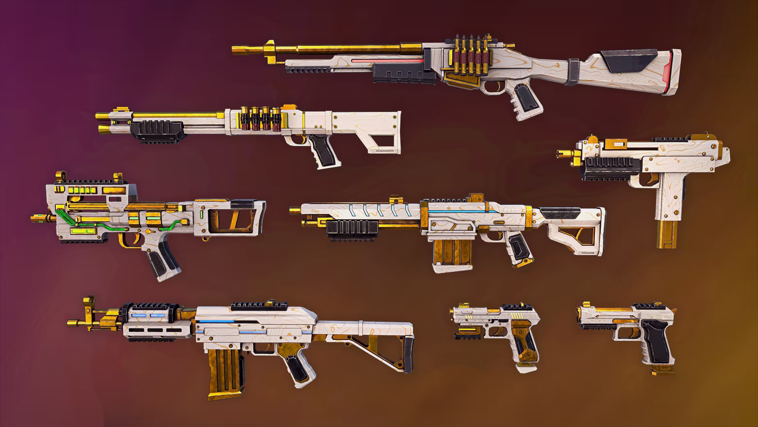 As a massive "thank you" for your support, this pack unlocks 8 exclusive, shiny white-marble-and-gold weapon skins. Your arsenal has never looked this premium!
