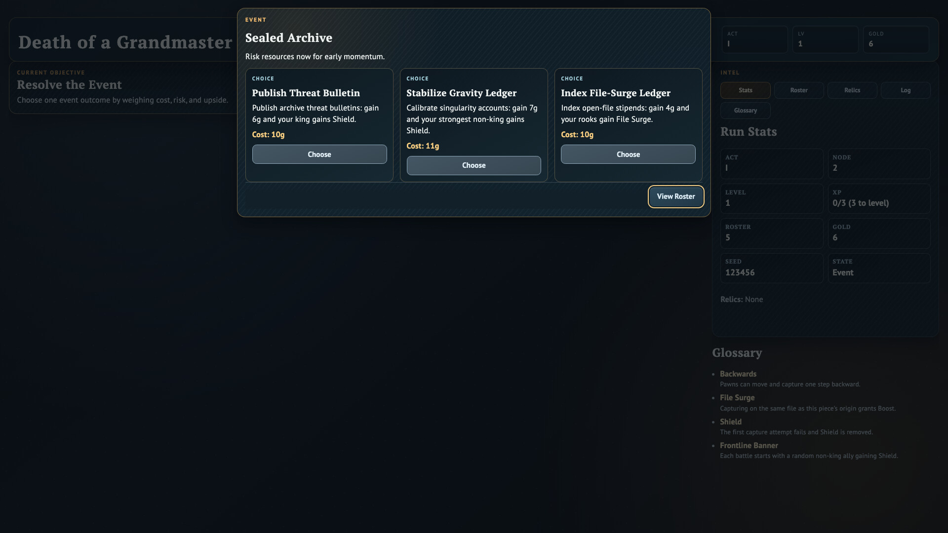 A tactical chess roguelike where you build a custom board, survive escalating combats, and break enemy kings with powerful relic and piece synergies.