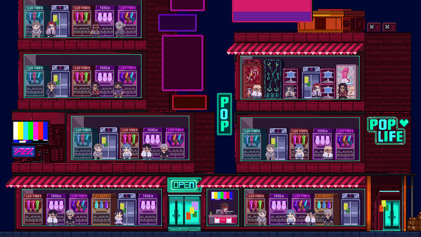 POPLife is a game about managing a sex shop in a cyberpunk city. Due to the nature of this game, there are interactions with characters in the game that deal with mature content such as characters asking questions about different types of toys in your store as well as asking for advice on what they should buy. At no point in the game is there any explicit sexual content shown. However, there is sexual content within the text of the game such as when characters talk to the player about what they are looking for within the shop or asking questions to the player about what to buy.