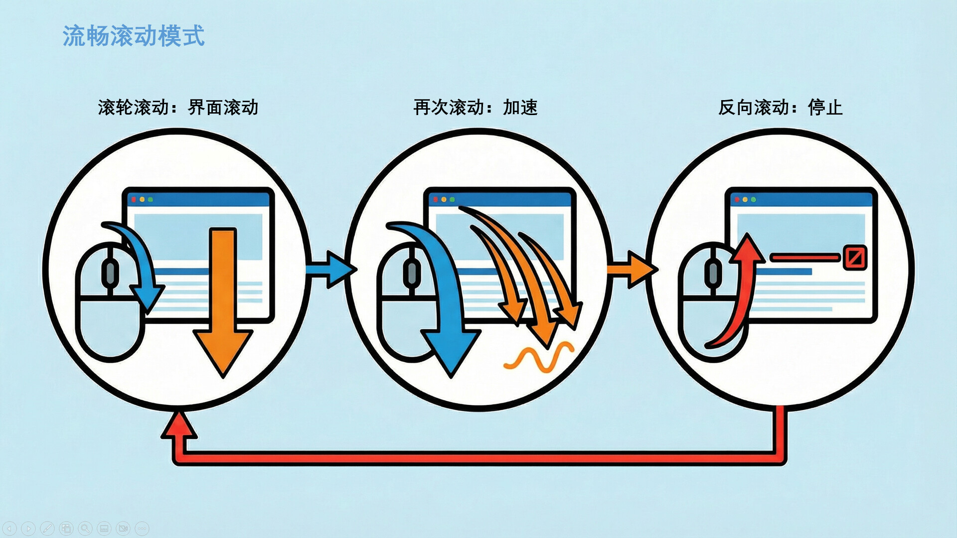 流畅滚动:滚动滚轮,屏幕平滑缓慢滚动,浏览内容,...,反向滚动滚轮,滚动停止。