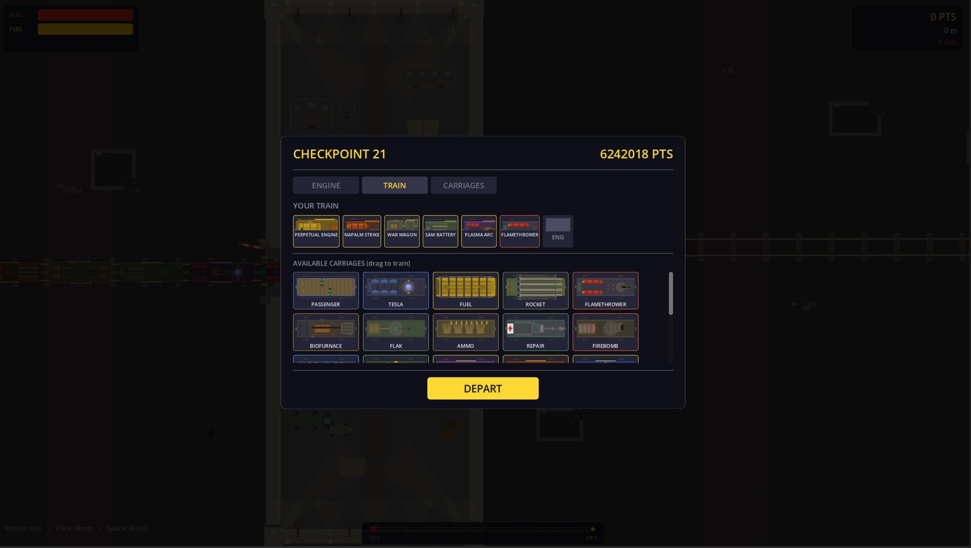 Between runs through the wasteland, you stop at depot stations to spend your hard-earned points. Upgrade your hull armour, fuel capacity, engine speed, weapon systems, and ram. Unlock new carriage slots with a slot machine that offers three random carriages to choose from. Every decision shapes your build.