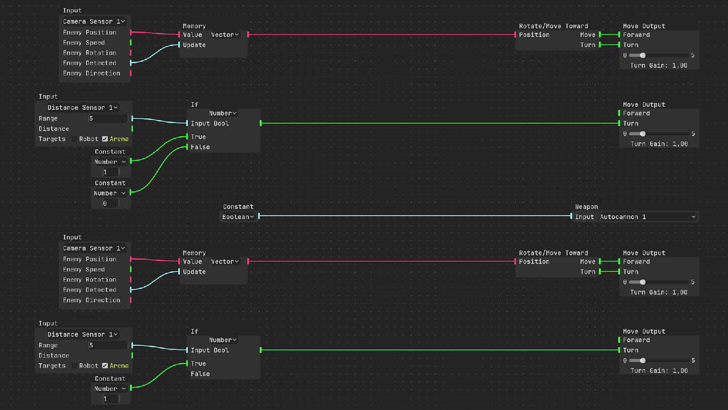 Program your robot’s AI in the Clank-Robotics Visual Scripting editor. You get to program how your robot acts based on the inputs it receives from the sensors you have placed. How smart can you make your robot?