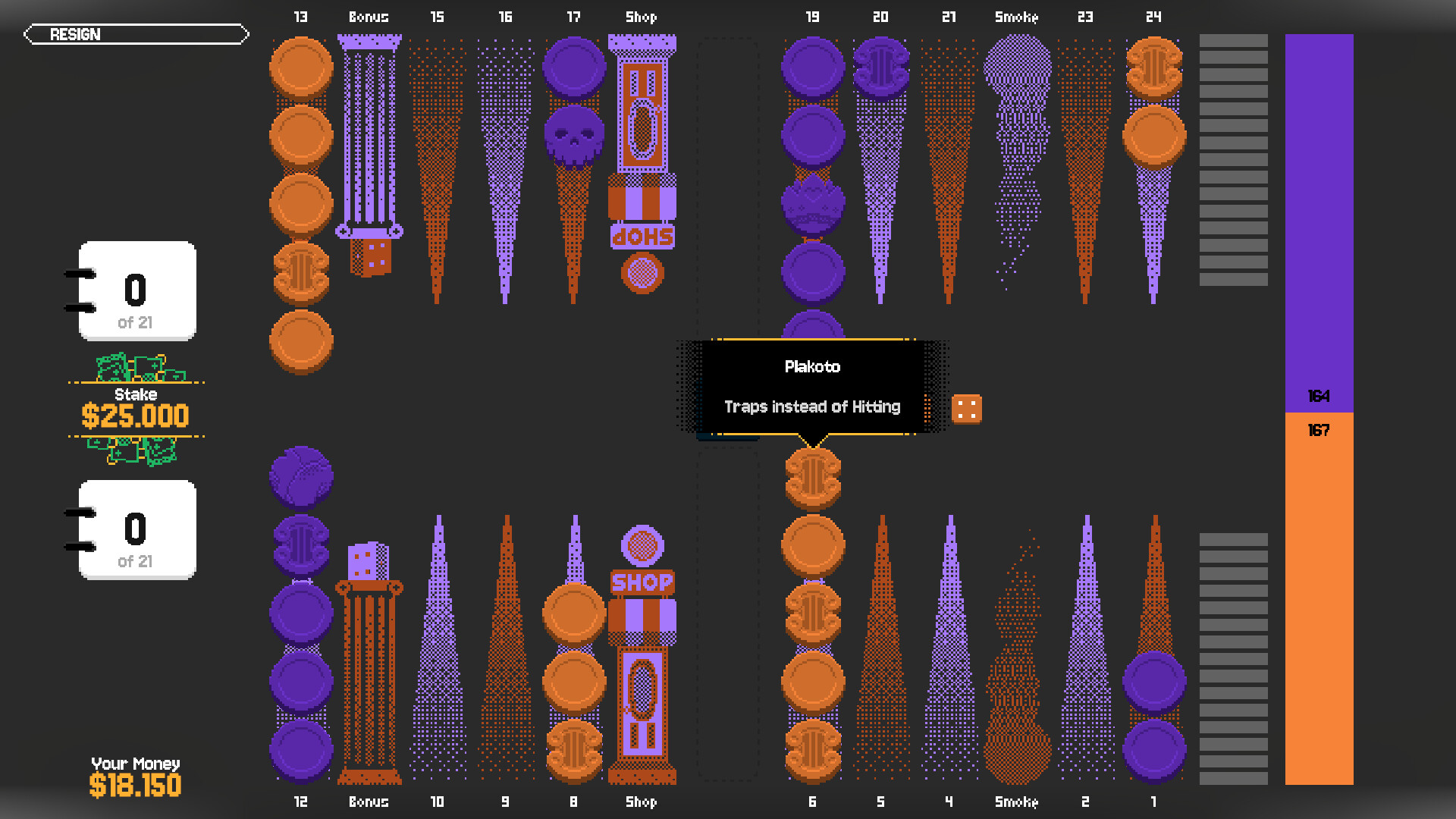 Grand Gammon mixes the simplicity of classic backgammon with enchanted dice, cursed boards, and a collection of one-of-a-kind checkers. Outsmart the odds, exploit rule-bending mechanics, and climb to the top as you roll the dice in this high-stakes roguelite experience!