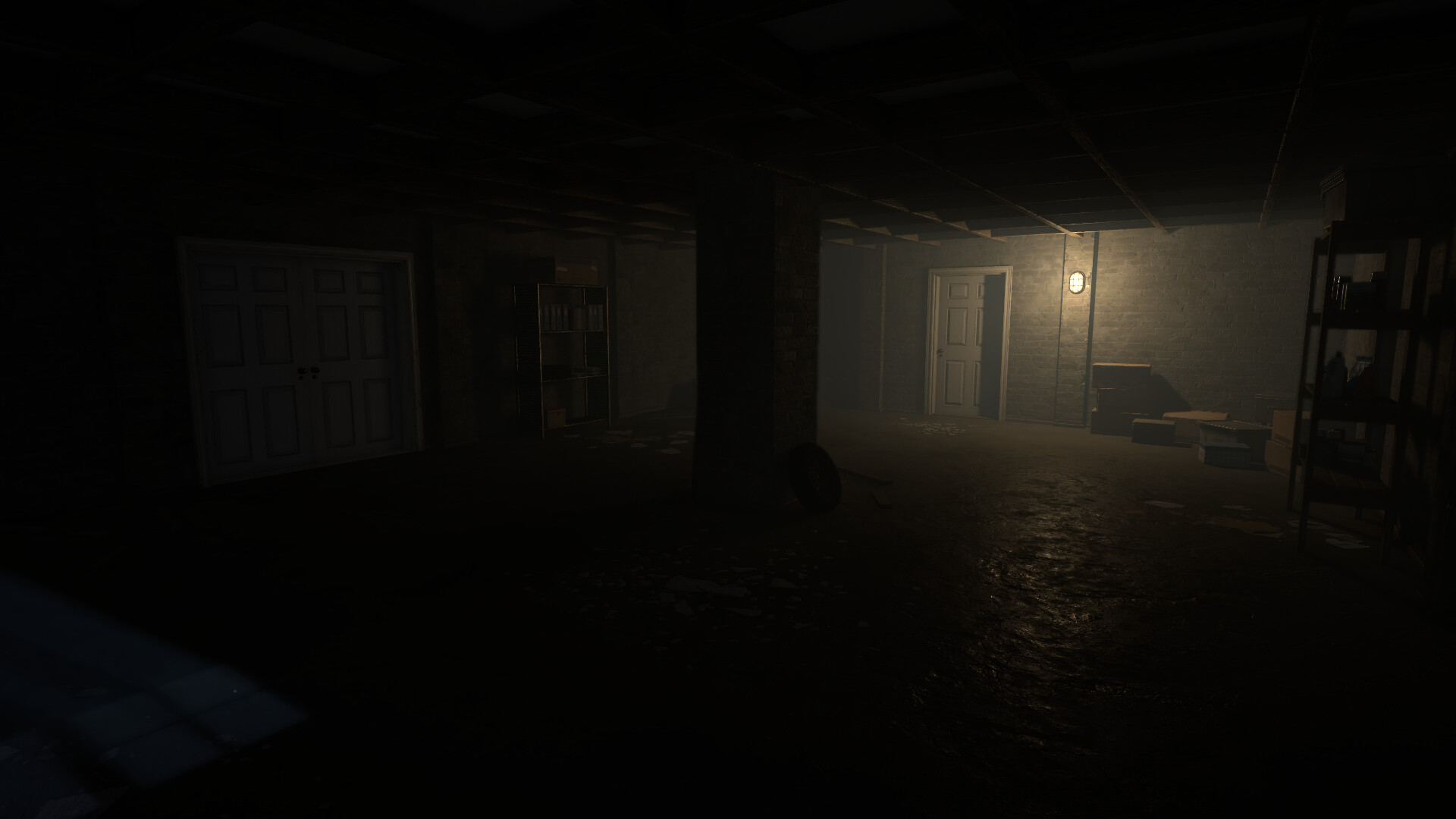 Volumetric fog and light beams shape the atmosphere of Silentia. Dense fog limits visibility, while beams of light cutting through the darkness heighten the tension.