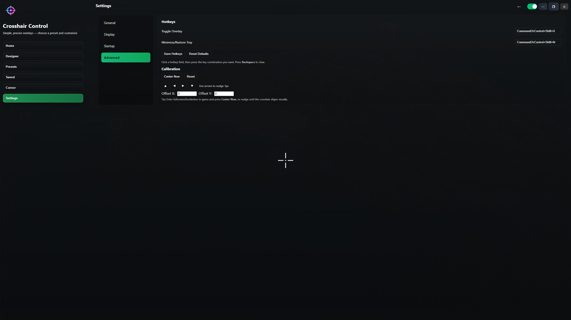 Built for speed and simplicity, Crosshair Control lets you quickly swap styles, save your favorites, and calibrate placement so your crosshair stays consistent across games.