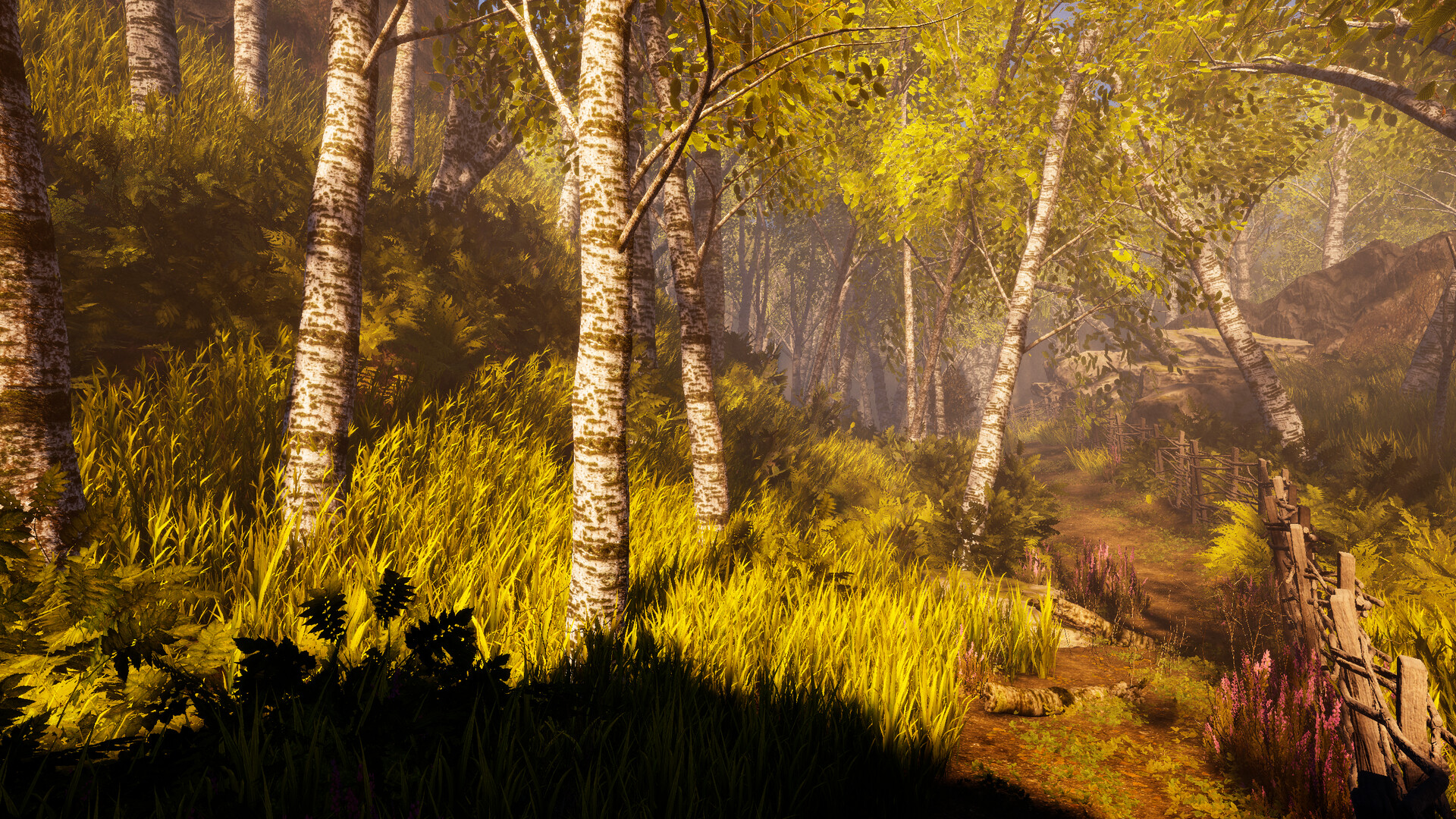 The experience begins with daylight exploration and camp preparation, then shifts into a darker and more hostile phase after a violent encounter. From that point on, the player must move deeper into the forest, navigate narrow routes and landmarks, and respond to a growing threat while the environment becomes less readable and more oppressive.