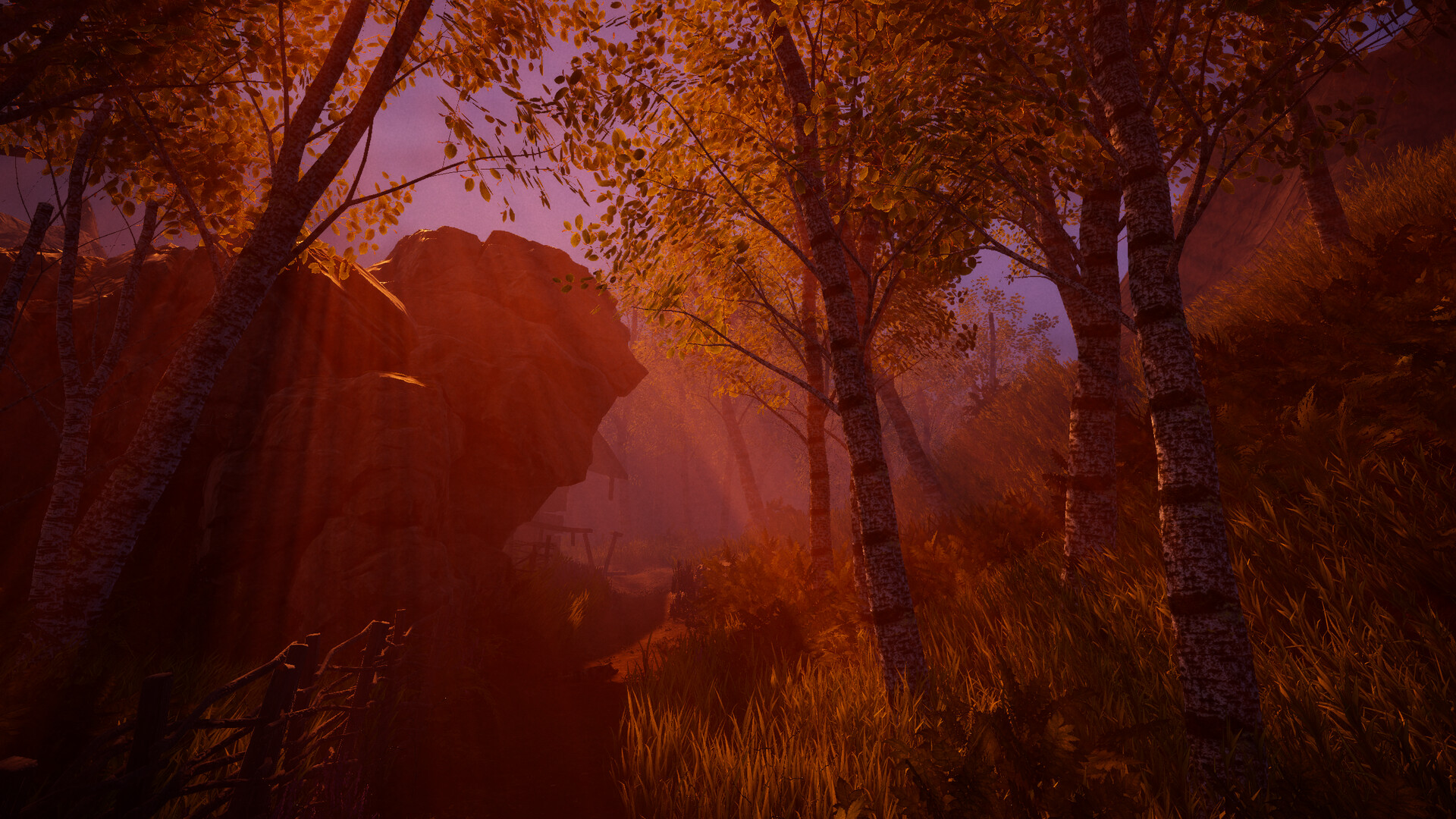 The experience begins with daylight exploration and camp preparation, then shifts into a darker and more hostile phase after a violent encounter. From that point on, the player must move deeper into the forest, navigate narrow routes and landmarks, and respond to a growing threat while the environment becomes less readable and more oppressive.
