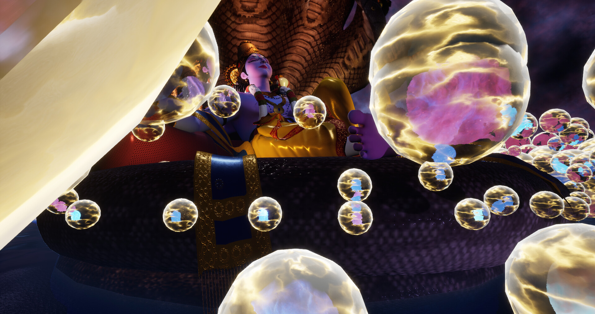 Embark on a transcendent VR journey through Hindu cosmology. Witness Lord Narayana resting upon the infinite Milky Ocean, explore floating universes within cosmic eggs, and experience the awe-inspiring cycle of creation and dissolution in this visually majestic virtual reality adventure.