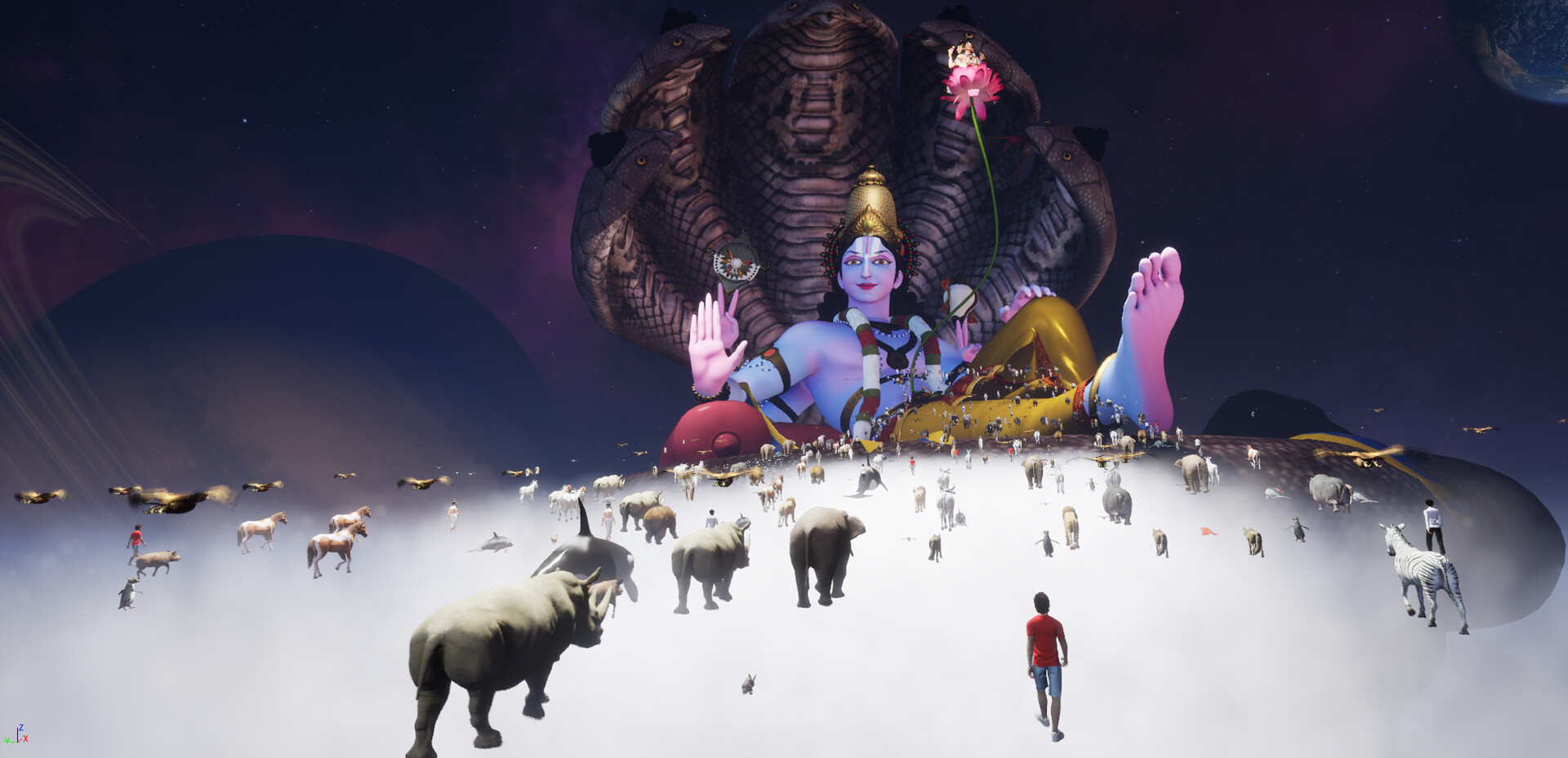 Embark on a Transcendent Cosmic Journey Narayana VR is an awe-inspiring virtual reality experience that invites you to step into the different worlds of Narayana where he resides. Leave the physical world behind and immerse yourself in an interactive spiritual journey where you will witness the scale of the universe compared to Lord Narayana, the cycle of creation, and the ultimate dissolution of all life.