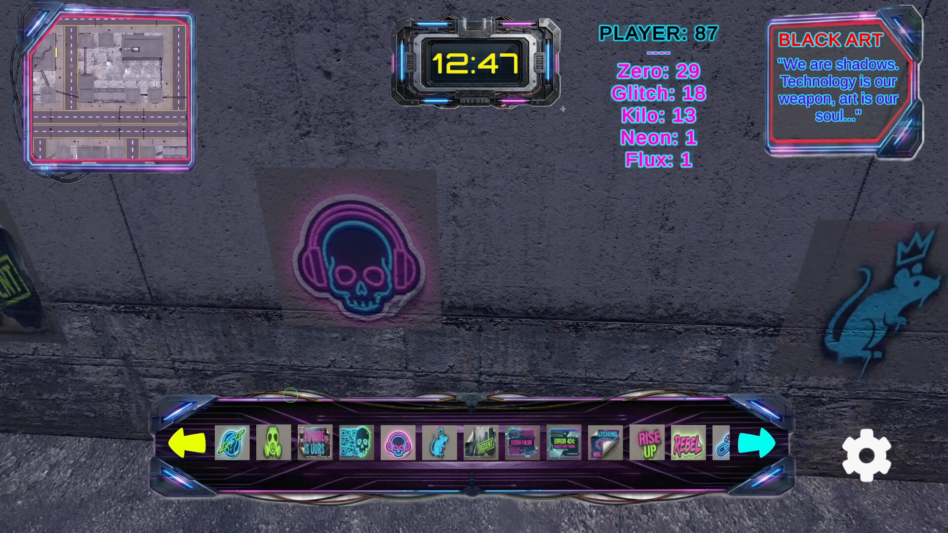 BLACK ART is set in a dystopian universe blending cyberpunk and steampunk themes. The game explores mature themes such as social rebellion, defiance of authority (expressed through actions like street art, graffiti, and hanging posters), and the pervasive dark, mature atmosphere inherent to this world.