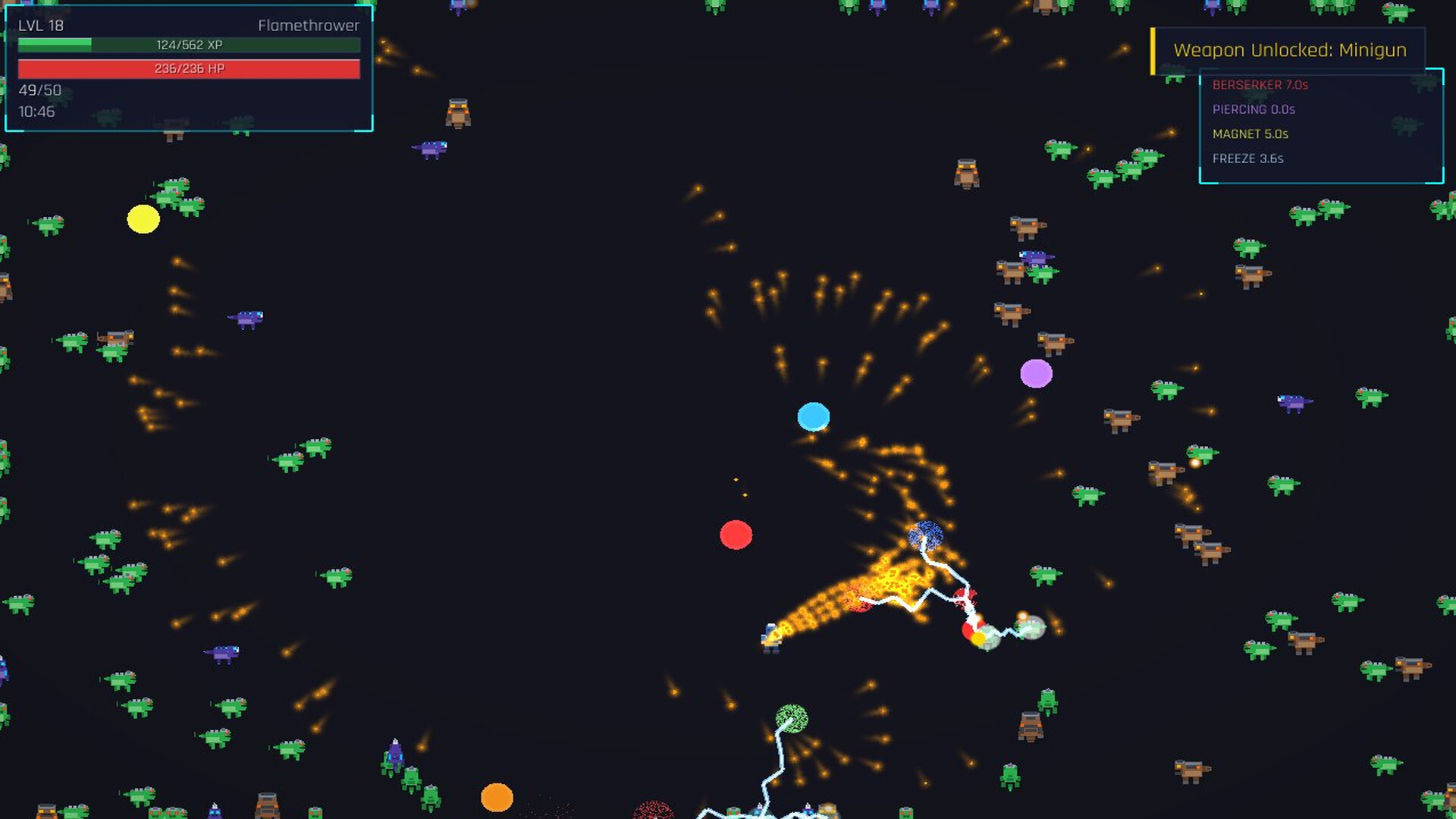 At 1 minute, you're comfortable. At 5 minutes, enemies pour in. At 10 minutes, the screen is a warzone with enemies spawning relentlessly, hitting harder, and soaking up more damage. There is no safe minute. There is no plateau. Only the next wave.